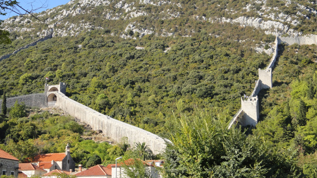 A cidade já foi cercada por muros, e você ainda consegue ver alguns deles pelas montanhas.